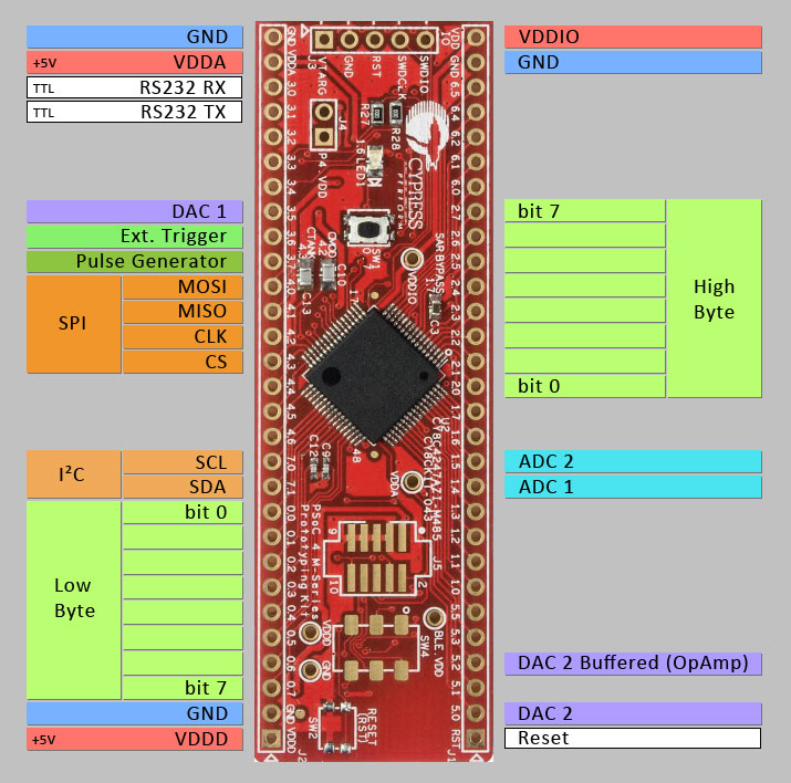 The software was developed using Cypresses 'PSoC Creator 4.2'. Link to the project files for the GPIO below. There's not much to do, except for building the project and programming it into the device.