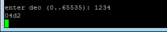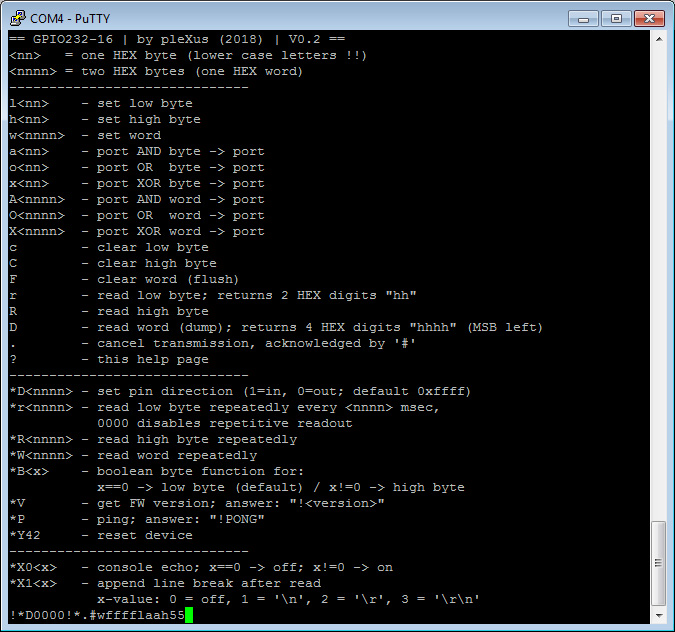 Note! For the sake of efficiency, there's no error detection on entering values. So, typing things like 'w03xy' (where the number is partly invalid in this example), will result in whatever. The firmware might even crash (yes, that's how lazy I am). But, commands can be cancelled at any time by typing '.' . Decimal input will overflow at 65535. The resulting value is usually useless but will always be a valid integer.