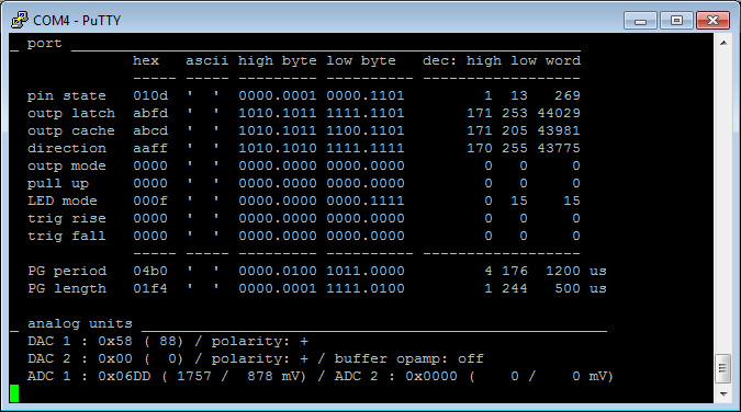 Means: "low byte output, high byte input"[*Dff00], "low byte output type: open drain"[*O00ff], "all pull-ups on"[*Pffff], "set low byte to 0″[0l], "set DAC 1 to 200(dec)"[200~a], "set DAC 2 to ff(hex)"[~bff].