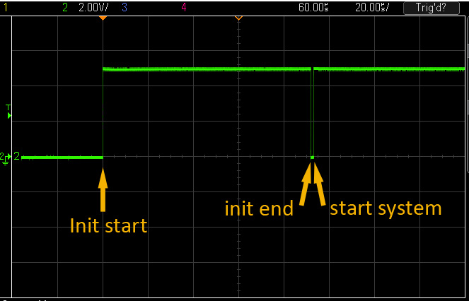 The LED on top of the board shows when an input is recognized by toggling on and off. During startup, this LED sends an init-pulse, means that it switches on at the beginning of the init routine and off after the complete init of the controller. After that it switches on again to indicate "power on". The LED is connected to pin 1.6. This pulse sequence is only visible using an oscilloscope. It's meant for diagnosis.