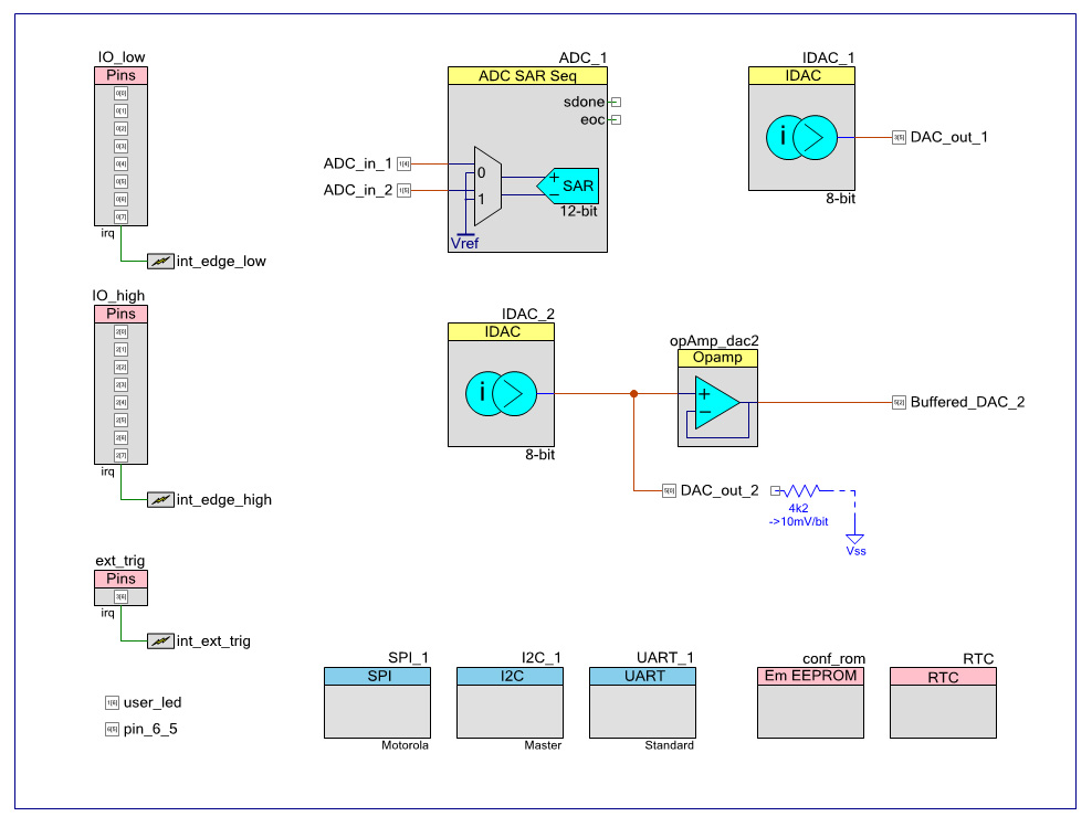 The ARM core is also pretty cool: 32 bits, 48MHz, comes with 128k Flash and 16k RAM. Their (Cypress) "PSoC Creator" comes with a decent compiler. Setting up the peripherals in the µC is neat. It's done by drag-and-drop. Most of the configuration is done via GUI. The IDE generates a pretty usable API for each module. You still have to dig through the header files, but it's all very self-explanatory. So it's good fun developing software for that thing.